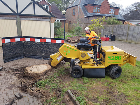The area and depth within which stump and roots are to be removed should be clearly stated. The work should be done by grubbing out by hand or with suitable machinery, or by destruction with a stump chipping machine. Please contact us for your FREE quotation. We have two machines one larger machine for big stumps with good access and a smaller pedestrian one which requires only 26 inches of access width for the areas of harder access.